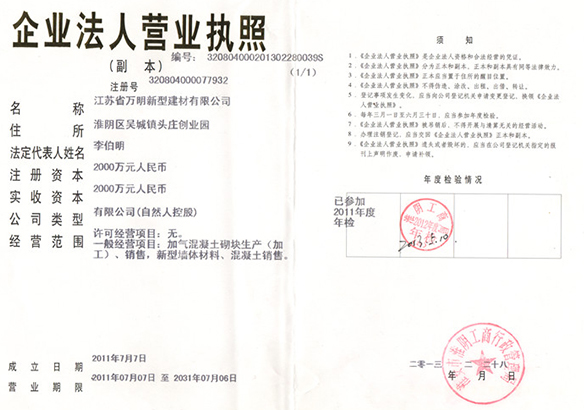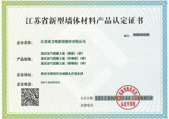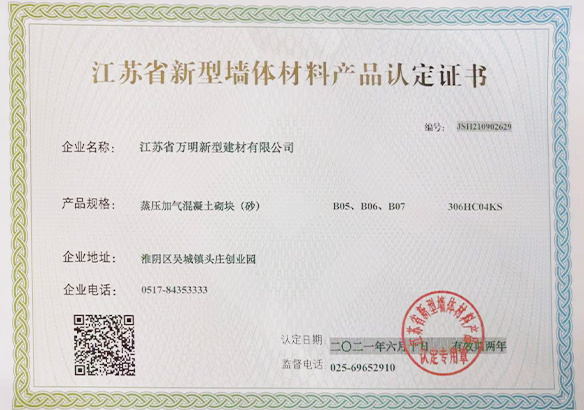 江蘇省萬明新型建材有限公司是一家多元化經營企業,專業生產新型墻體材料、蒸壓砂加氣砌塊、蒸壓灰加氣砌塊、混凝土砌塊銷售。本公司所生產的新型墻體材料、蒸壓砂加氣砌塊、蒸壓灰加氣酥塊、混凝土砌塊填補了江蘇省企業市場空白,產品質量符合標準,并被江蘇省墻體材料改革辦公室認定為綠色新型墻體材料,是江蘇具活力的企業之一。
